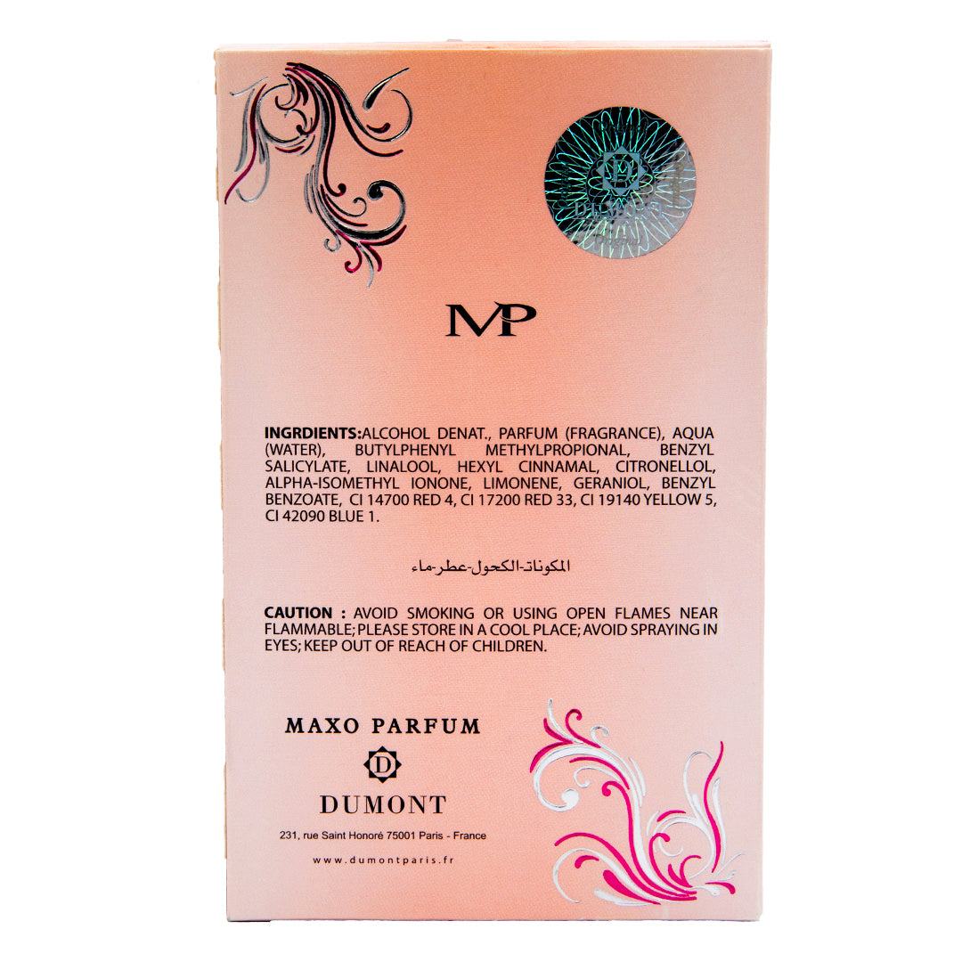 This Dumont Scent contains formation ingredients like- Butylphenyl Methylpropional, Parfum (fragrance), Aqua (water), Alcohol Denat, Benzyl Benzoate, Geraniol, Hexyl Cinnamal, Citronellol, Limonene, Benzyl Salicylate, Alpha- Isomethyl Ionone, Linalool.